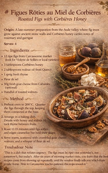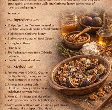 # Figues Rôties au Miel de Corbières Roasted Figs with Corbières Honey Origin: A late-summer preparation from the Aude valley, where fig trees grow against ancient stone walls and Corbières honey carries notes of rosemary and garrigue Serves: 4